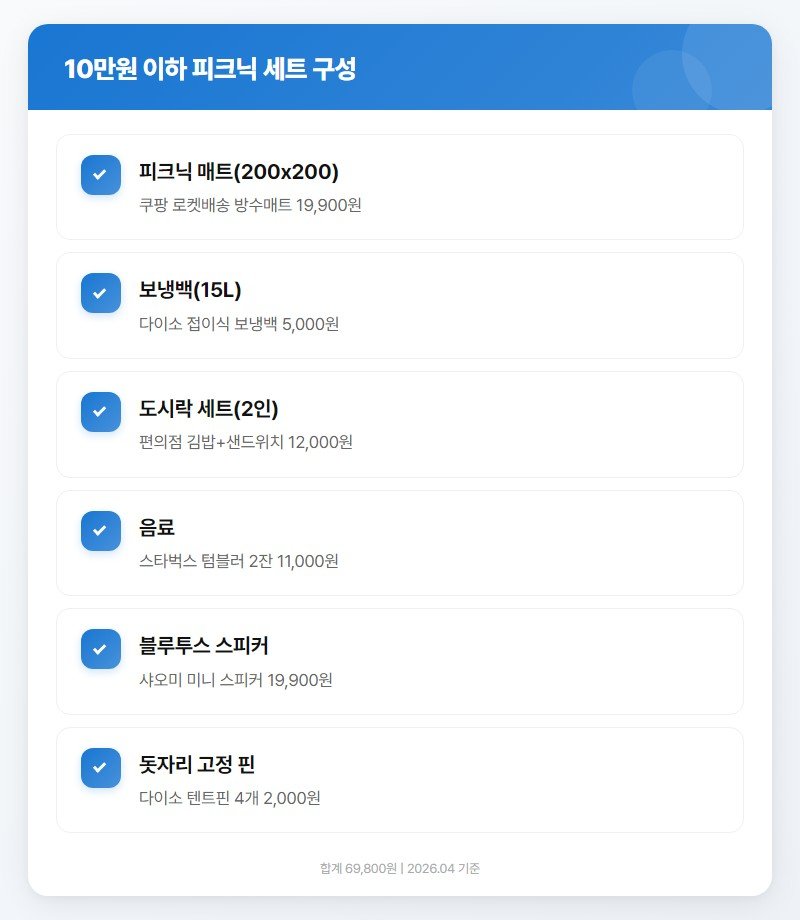 피크닉 장비를 아직 안 갖추고 있다면, 위 구성이면 10만원 안에서 전부 해결돼요. 남은 예산 3만원으로 현장에서 디저트나 간식을 추가하면 딱 맞아요. 매트와 보냉백은 한 번 사면 시즌 내내 쓰니까 가성비가 꽤 괜찮거든요.