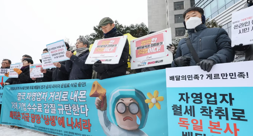 점주들 입장에서는 월 8만8천 원 고정 비용이 갑자기 월 100만 원 이상의 수수료로 불어나는 셈입니다. 지난 3월, 분노한 자영업자들이 배민 본사 앞에서 “배민 OUT”을 외치며 농성을 벌인 것도 이 때문입니다.